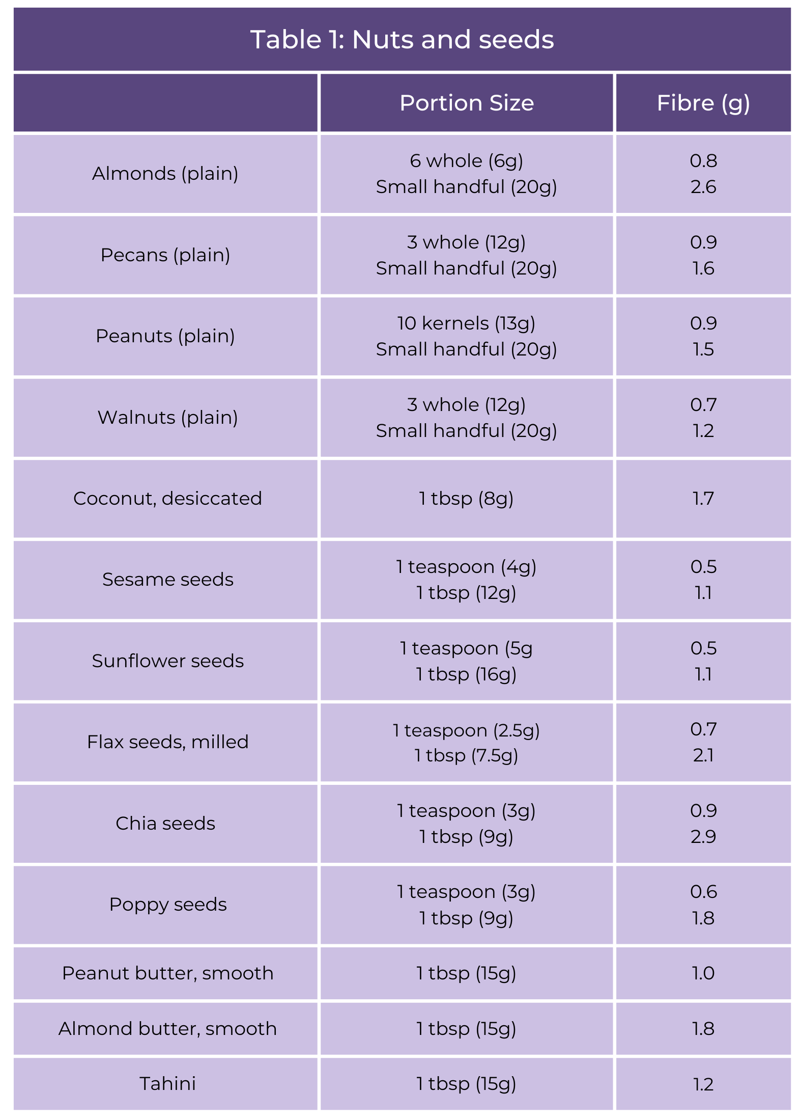 - Approach each meal as an opportunity to increase fibre and think of what fibre sources you can add. E.g. can you add a tablespoon of seeds to top a bowl of porridge? Can you add a handful of berries to have with your lunch or as a snack?